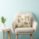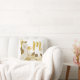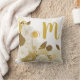 Moderne gooi kussen met bloem in golden en wit en een aanpasbaar gouden monogram. Witte achtergrond