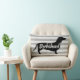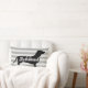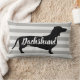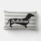 Moderne zwarte dachshund weenie dog silhouette met wit script gezegde "Dachshund". De achtergrond is een gestreepte grijze patroon en de achterkant van de kussen is zwart met witte poka stippen.