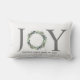 De moderne Joy manuscriptdouane greenery met grote vakantie werpen kussen. Dit stampmodel wordt op de voor- en achterkant van de klassieke witte kussen weergegeven. © Julie McIver