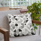 Dit moderne kussen heeft een monochroom naadloos geometrisch patroon met verschillende lijnen en vormen in zwarte en grijze tinten op een witte achtergrond.