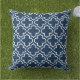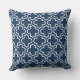 Stijlvolle kussen hebben een modern decoratief Marokkaans quatrefoliepatroon in wit. Pas de blauwe achtergrond van de marine aan om met uw openluchtdecor te coördineren.