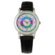 Dit artistieke kleurrijke horloge is versierd met een psychedelisch lijst van levendige groene, blauwe, fuchsia, rode en zwarte cirkels en spiralen, waardoor een adembenemend hedendaags abstract kunsteffect ontstaat. Op een bleke pastelroze achtergrond kunt u de nummers lezen in een donker paarse sierkrabbel - zoals lettertype. Dit originele creatieve accessoire geeft een vrolijke en bizarre Alice in Wonderland-sfeer aan je stijl, of voegt een vleugje vrolijkheid toe aan een schattige outfit.