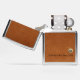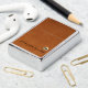 Een minimalistisch monogrammeontwerp met een klassiek blokmonogram typografie-initiaal op een geborsteld metalen goudembleem met een gepersonaliseerde naam hieronder op een zachtbruine lederen achtergrond. Perfect accessoire of aangepast cadeau voor elke gelegenheid.