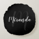 Modern script, aangepast monogram en naam zwart rond kussen