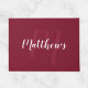 Gepersonaliseerde Monogram- en naamcadeautjes met een gepersonaliseerde familienaam in witte, moderne lettertypestijl en monogram in lichtbruine rode, moderne tekenstijl als achtergrond, op een rode achtergrond. Ideaal als cadeau voor nieuwigheden, vakantiecadeau voor familie, gezinshereniging, cadeau voor het huishouden en cadeau voor speciale gelegenheden.