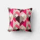 Mijd kussen in een Mid-Century Modern ontwerp van gelaagde driehoeken in tinten van fuchsia roze, lichtroze en stenen grijs/grijs, voorzien van witte letters