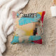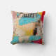 Een kunstzinnig en modern collage stijl gooien kussen. Stijlvol kussen met gooi heeft een abstract schilderontwerp in een blauw, rood en geel palet met zwarte accenten. Ontworpen voor u door Blackberry Boulevard.