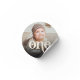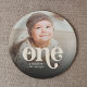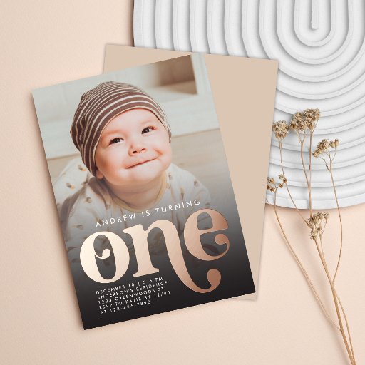 Een moderne en minimalistische eerste verjaardagsfoto met een boho en bohemian retro stijl typografie van "One" in het onderste centrum en een leuke foto van je baby. Personaliseer de details en het afbeelding. De kleur van de achtergrond is boho bruin.