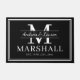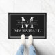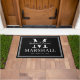Moderne, gepersonaliseerde zwarte en witte grote doormat met de paren voornamen in een kalligrafiekmanuscript bovenop het familiemonogram, volledige familienaam, en trouwdatum beschikbaar in klantgerichte sjablonen. Een, elegant nieuw geschenk of nieuw huisje cadeau voor de bruid en bruidegom met een persoonlijke aanraking op maat.