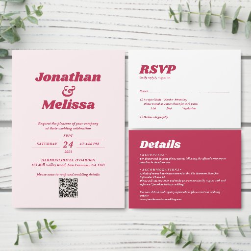 Een moderne unieke retro bruiloft uitnodiging die beschikt over een stijlvolle, elegante typografie script met de trendy kleur viva magenta en heeft een QR Code voor de bruiloft website en alle details en instructies die uw gast nodig heeft in staat voor hen om rsvp online en zie uw bruiloft website voor alle details.