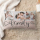De moderne kussen van de douanefoto collage met ruimte voor 3 foto's die een trendy schemerige manuscript lezen FAMILIE en uw douanenaam hieronder. Dit is de huisversie met pastelroze linnen burlap.