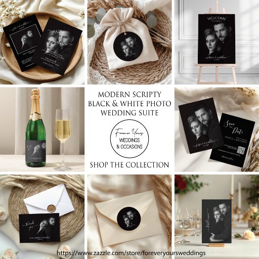 Deze elegante en tijdloze moderne zwart-wit huwelijksuitnodiging is voorzien van een foto op de voorkant, met zowel een foto als een QR-code op de achterkant. Het eenvoudige en stijlvolle ontwerp maakt het geschikt voor elk seizoen. Om uw uitnodiging te personaliseren, klikt u op 'Personaliseer dit ontwerp', voert u uw informatie in en Zazzle zorgt voor de rest. Er zijn ook gratis items beschikbaar.