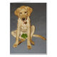 Een mannelijke labrador die zit en een vijgenblad draagt
