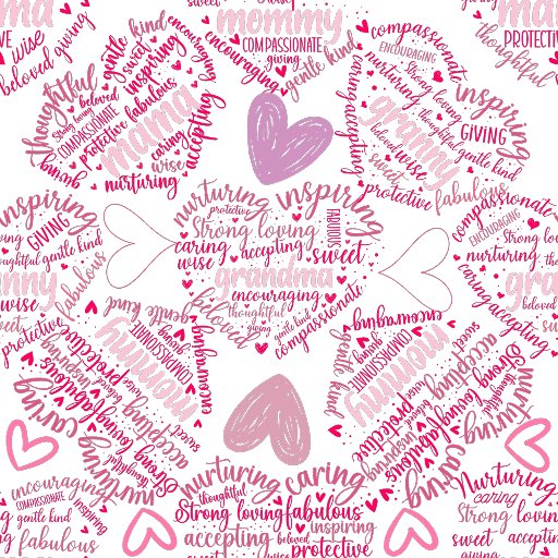 Moederdagen harten 01.Roze Woorden- en symbolenpatroon in hartvorm voor Moederdag Dit afbeelding is een mooie en ingewikkelde woordwolk die moeders en grootmoeders viert. De woorden zijn gerangschikt in een hartvorm, met de woorden "mama", "oma" en "mama" prominent aanwezig. Andere woorden zijn "medelevend", "inspirerend", "koesterend", "zorgzaam", "liefdevol", "bedachtzaam" en "beschermend". Het afbeelding is gevuld met roze harten en wervelingen, waardoor een gevoel van warmte en liefde ontstaat. Het algemene effect is er een van viering en waardering voor de speciale vrouwen in ons leven.
