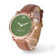 Dit elegante rozen gouden stijlvolle mannen is versierd met een robuuste bruine band, een groen gezicht en gepersonaliseerd met monogram en naam. U kunt het monogram en/of de naam eenvoudig wijzigen en desgewenst de witte vinkjes verwijderen. Wat een geweldig geschenk voor hem - een beste man, groomsman, bode, afstuderen, vaderdag, verjaardag, of een andere speciale gelegenheid. Alle rechten voorbehouden © 2024 Alan & Marcia Socolik.