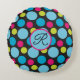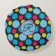 Een kleurrijk motief van blauw en hete roze stippen op een zwarte achtergrond op dit monogram gooi kussen. Pas het aan met uw initiaal met behulp van de "personaliseer"-optie.