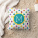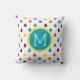Dit schattige kussen heeft een fel regendruppelpatroon in tinten van rood, sinaasappel, geel, groen, blauw, paarse, roze en blauwgroen op wit. Personaliseer het bijpassende blauwgroen en gele monogram met uw keuze van initiaal.