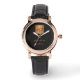 Luxe elegante zwart lederen look horloge voor vrouwen met een gouden glitter monogrammed vierkant en gepersonaliseerde naam handtekening.