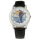 Dit unieke horloge heeft een marineblauwe silhouet honkbalspeler leunend op zijn knuppel. Het afbeelding is geplaatst op een retro stijl cirkel gouden en blauwe streep achtergrond. Je drieletterige monogram staat aan de rechterkant. Zwarte cijfers rond de perimeter maken het horloge gemakkelijk af te lezen.