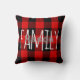 Rustic lumberjack plaid pillow perfect voor landdecor - Monogrammed in het centrum met de familienaam in grijs omlijsting op roestachtige stijl met de tekst 'FAMILY'. Robuuste, preppy rode en zwarte buffels controleren vlekkelvormige patroonachtergrond. Hetzelfde aan beide zijden. Cozy gingham home decor voor een rustige blokhut. Mooie cadeautje voor het huishouden.