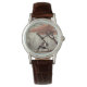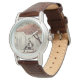 Une montre délicate et élégante au poignet avec un design captivant d'une jeune femme lisant un livre sur une balançoire sur fond d'un paysage urbain animé. Le coque or rose et la bracelet en cuir noir de la montre dégagent de la sophistication, tandis que les détails complexes de l'illustration ajoutent une touche de fantaisie.