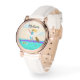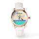 Personnalisez cette jolie montre pour les jeunes filles, ou les adolescentes qui adorent faire du paddle-board. Ma propre illustration contient des couleurs tropicales et SUP fun comme une fille blonde pagaie son chien dans l'eau bleue tropicale. Une tortue de mer nage à côté. Son nom peut être ajouté en haut de l'image. La bande violette n'est qu'une des nombreuses couleurs disponibles. Cela fait un cadeau unique et amusant à toute jeune femme extérieure.