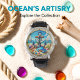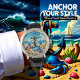 This circular wall clock features a vibrant beach scene with a prominent blue anchor wrapped in rope. A bright blue crab and various seashells, including a large pink one and several smaller multi-colored shells, are scattered on the sandy shore. In the background, white sailboats dot the blue ocean under a partly cloudy sky with seagulls flying. The clock is encased in a golden, ribbed frame.