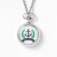 Branches d'olivier vertes, ancre bleue, et Femme de marine sur un manteau bleu.