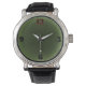 Montre pour hommes surdimensionnée avec un visage Art Déco original et unique, laissant entendre un feu vert jade brillant. Le "12" est en rouge corail, tandis que les autres chiffres sont en noir brillant.