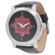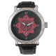 Cette montre dramatique au poignet présente un visage noir avec des chiffres gris et un magnifique médaillon rouge.