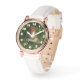 Une montre avec la photo d'un magnifique loup gris et velouté. Dans l'arrière - plan est une forêt sombre avec des arbres. Vibe mystique magique.
