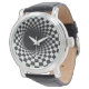 A tunnel-like optical illusion is created using a black and white checkered pattern, giving a dizzying sense of depth