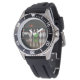 Une montre avec la photo d'un porte-épingles abattu par une boule de bowling verte.