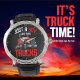This vibrant wall clock is perfect for any young fan of big rigs. Set against a black background with a bold red rim, it showcases a detailed illustration of a red semi-truck. The text "JUST A BOY WHO LOVES TRUCKS" is prominently displayed in a combination of white and red lettering, making it an ideal and eye-catching piece for a child's bedroom or playroom.