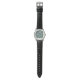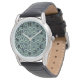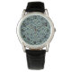 Cette montre masculine a un design géométrique de cercles en rangs avec des cercles ou ovales à l'intérieur en bleu sur un champ de vert.