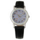 Cette montre pour femmes a un design géométrique de cercles en rangs avec des cercles ou ovales à l'intérieur en marron sur un champ de bleu.