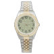 Cette montre pour femmes a un design art déco de trois ovales répartis sur deux rectangles très minces en vert camo sur un champ de vert clair. Voulez-vous le même design avec des couleurs différentes? Message