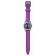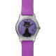 Montre personnalisable au poignet de chat noir avec un chat noir déchaîné qui a déjà vécu huit de ses neuf vies et des bandes de couleur violette. Ce chat diabolique est toujours méchant. Cette méchante montre de chat noir fera un grand cadeau à quelqu'un qui aime les chats.