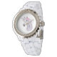 Une montre fantaisiste au thème de la licorne avec un groupe blanc et des détails étincelants. Les points forts sont le design complexe et les couleurs vibrantes, tandis que des lumières douces et diffuses rehaussent son charme.