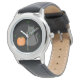 Cette montre impressionnante présente l'image art numérique d'un mignon chat gris avec oreilles noires, nez et bouche et yeux vert vif. Le chat porte un collier vert avec un charme de pierres précieuses orange vif et doré. Le chat est assis à côté d'un citrouille orange.