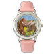 Deux chevaux islandais debout côte à côte, grignotant leurs têtes, dans un champ fleuri jaune de colza par jour ensoleillé devant le ciel bleu au printemps, un châtaignier et un poney couleur pomme argentée. Une mignonne photo de poney prise par Katho Menden. Cette montre à cadran est une idée cadeau pour les amateurs de chevaux.