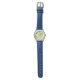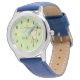 Une montre personnalisée avec un mignon singe brun balançant d'une branche d'arbre. Le visage de l'horloge a des chiffres fantaisistes. L'arrière - plan est de couleur vert olive.