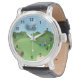 Ce golfing Watch dispose d'un arrière - plan de golf avec un trac à sable et un drapeau de golf, une voiturette de golf rouge, une voiturette de golf bleue avec des sacs de golf. Le texte décoratif est Golf. Les numéros de montre peuvent être supprimés, si vous préférez votre montre sans eux. Un cadeau parfait pour le golfeur de votre vie. Choisissez le style et la couleur de votre montre ! Cette conception a été créée à l'aide d'oeuvres originales© www.delightful-doodles.com