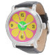 Montre super des années 60 avec fleurs jaunes et vertes sur arrière - plan rose. Les couleurs fracassantes ont fait fureur dans les années soixante. Gros nombres sur 12, 3, 6 et 9 pour une lecture facile. Soyez prêt à montrer cette montre car c'est un original, surtout parce que les années 60 étaient il y a longtemps.