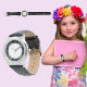 Montre pour enfants en acier inoxydable avec bracelet en cuir noir. Décor noir arrière - plan blanc design et visage de montre numérique. Ajoutez de l'art, des couleurs derrière l'image de la montre ou gardez le look. Contactez admin@giftsyoutreasure.com pour obtenir de l'aide et des liens directs vers tout produit à customiser.