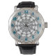 A two-tone blue clock numerical face on black and white circulaire ciroll-like pattern embedded with stars, swirls and sunbursts and circles.