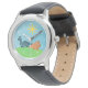 Dinosaures Brontosaurus et Triceratops, mignons et ludiques, sur une colline verte au soleil. Cette adorable montre au poignet à thème en dinosaure serait un cadeau merveilleux pour un jeune garçon.