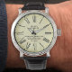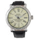 Une montre conçue comme un cadeau pour reconnaître le service loyal d'un directeur d'entreprise. Ajoutez le nom du destinataire ainsi que la société ou l'organisation. Arrière - plan de style parchemin. Montre de présentation. Cadeau long service.