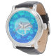 Dauphin sautant à travers un symbole du soleil maori avec un océan bleu et voilier derrière. Tortues Honu bleu et fleurs d'hibiscus bleu arrière - plan motif.
