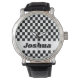 Cool, coutume, unique, montres unique a un design de drapeau à damiers noir et blanc sur l'avant. Personnalisez le devant en changeant le nom à ce que vous voulez. Cela ferait un grand cadeau pour les amateurs de voitures de course dans votre vie. Veuillez consulter nos autres options de vérification personnalisées.